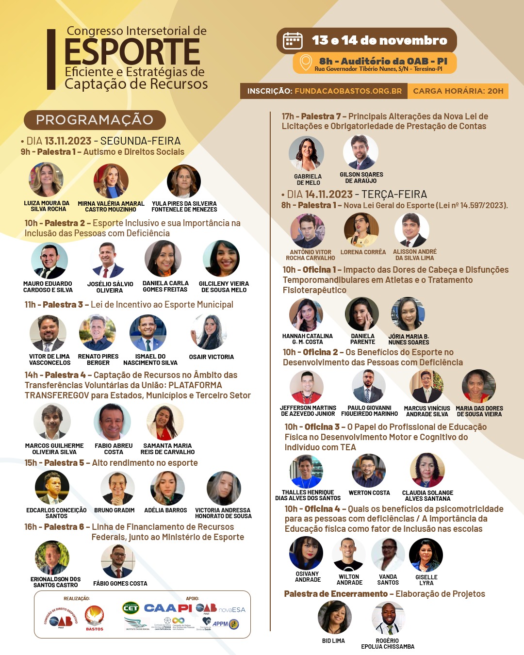 A Comissão de Direito Desportivo da Ordem dos Advogados do Brasil, Seccional Piauí, em parceria com a Fundação Bastos, realiza nos dias 13 e 14 de novembro, no auditório da Seccional em Teresina, o Congresso Intersetorial sobre Esporte Inclusivo e Estratégias de Financiamento para Projetos Esportivos.