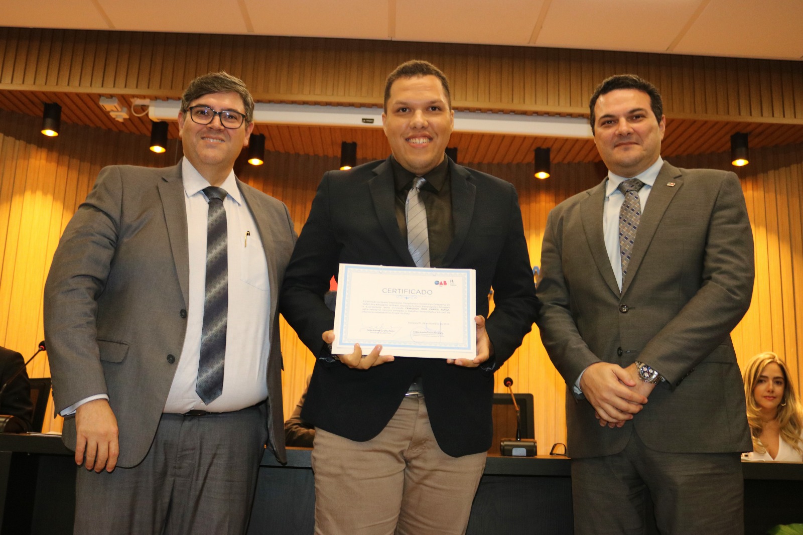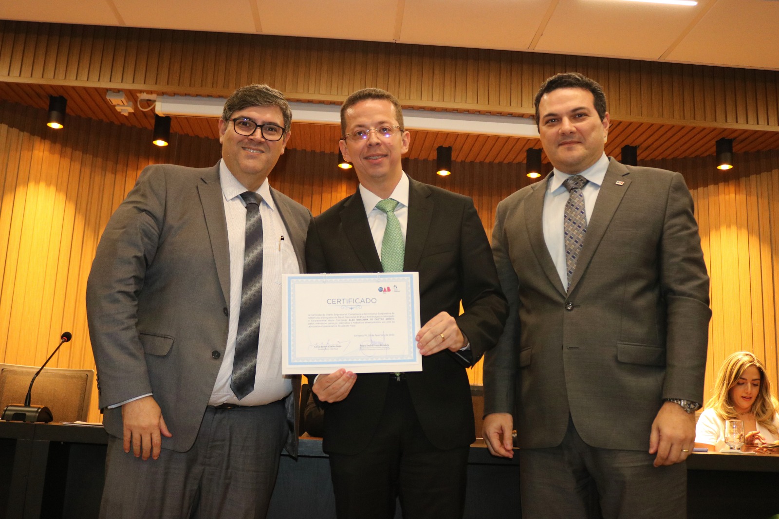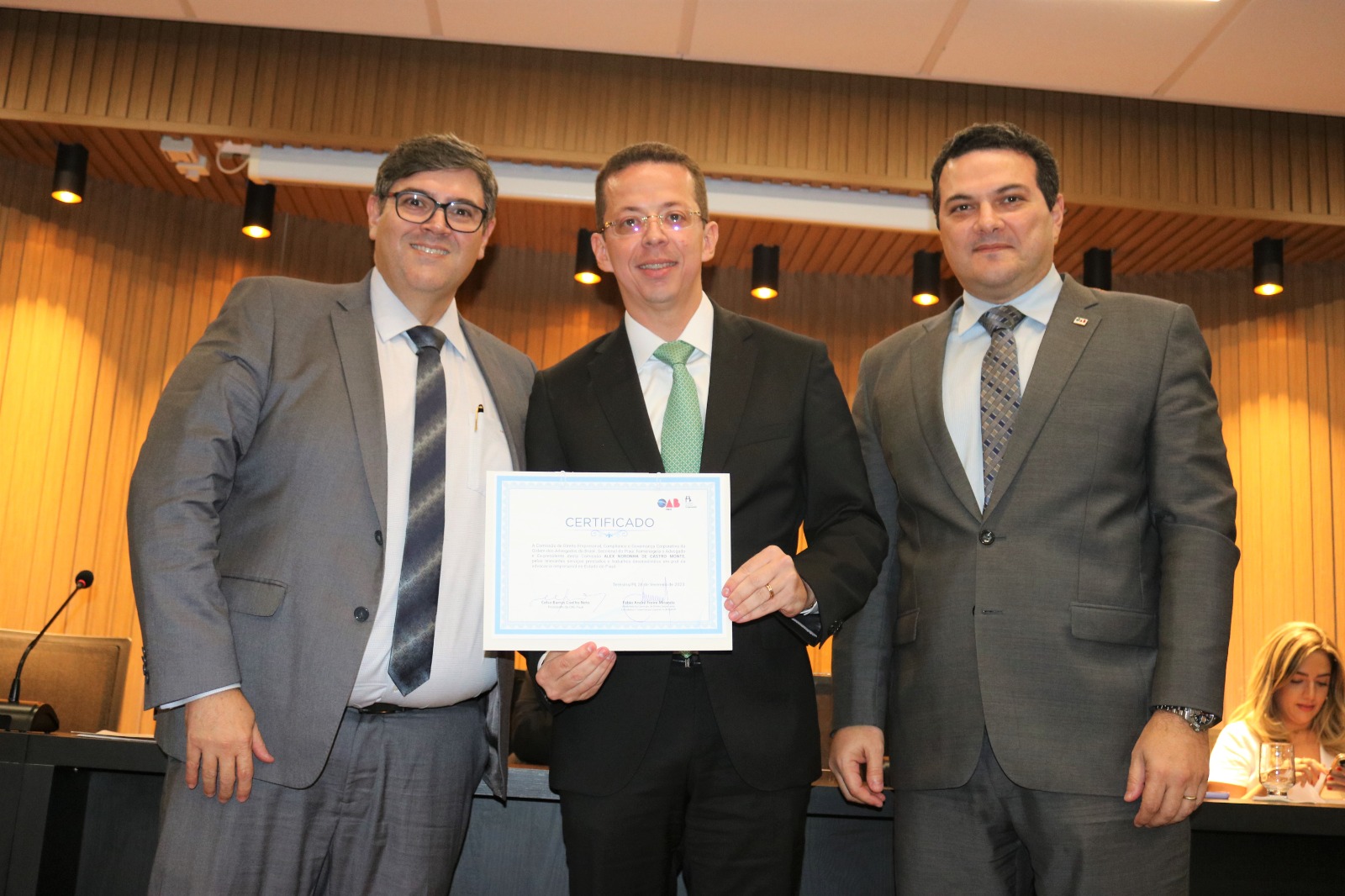 Alex Noronha recebeu um certificado pelos relevantes serviços prestados e trabalhos desenvolvidos em prol da Advocacia Empresarial no Piauí. “Tive a honra de ser o proponente da criação e primeiro presidente da Comissão de Direito Empresarial que agora completa 10 anos de intensa atuação. O evento desta noite foi muito gratificante e duplamente emocionante”, destaca.