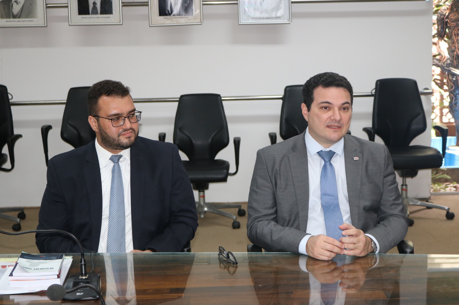 Thiago Carcará, professor e diretor da Escola Superior da Advocacia (ESA-PI), durante a reunião, apresentou algumas publicações da editora da OAB-PI para o reitor Gildásio Guedes.