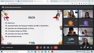A pauta do encontro foi a exposição da pesquisa inédita intitulada “Conhecimentos, atitudes e práticas sobre alfabetização no Piauí”. O Instituto Datafolha e a Associação Bem Comum (ABC) foram os responsáveis pela realização da pesquisa. Além disso, também houve a apresentação das ações que estão sendo implementadas em 2022 pela Coordenação do projeto.