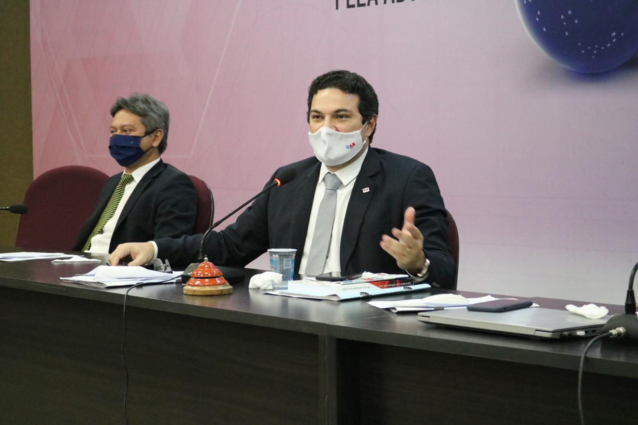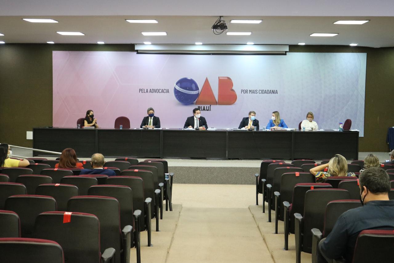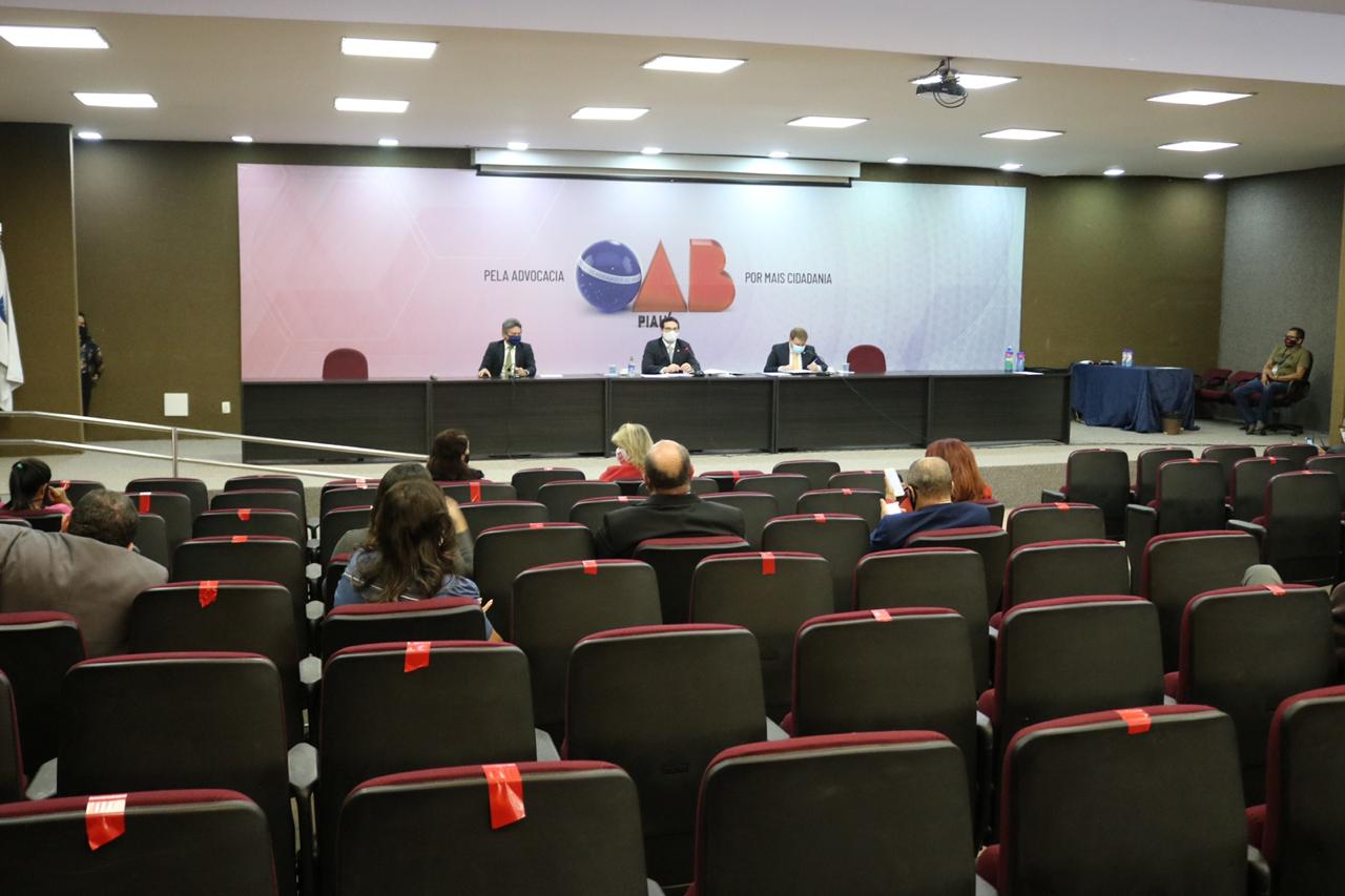 Exaltando a decisão do Conselho Federal da OAB e reiterando o compromisso da Seccional Piauí com a equidade de gênero, o Presidente da Ordem dos Advogados do Brasil, Seccional Piauí, Celso Barros Coelho Neto, deu início à Sessão Ordinária do Conselho Seccional, nesta quinta-feira (17), frisando o valor do papel da mulher Advogada. A última Sessão do ano de 2020 aconteceu no Auditório da instituição, reunindo a diretoria da OAB, Leonardo Airton (Secretário-Geral), Nara Letícia Couto (Secretária-Geral Adjunta) e Einstein Sepúlveda (Diretor-Tesoureiro); a diretoria da CAAPI, Andréia Araújo (Presidente), José Urtiga (Vice-Presidente), Ravennya Moreira (Secretária-Geral Adjunta) e Josélio Sávio (Diretor-Tesoureiro); o Diretor-Geral da ESA Piauí, Aurélio Lobão; o Conselheiro Federal da OAB Thiago Carcará, além dos demais Conselheiros e Conselheiras Estaduais, Advogados e Advogadas.