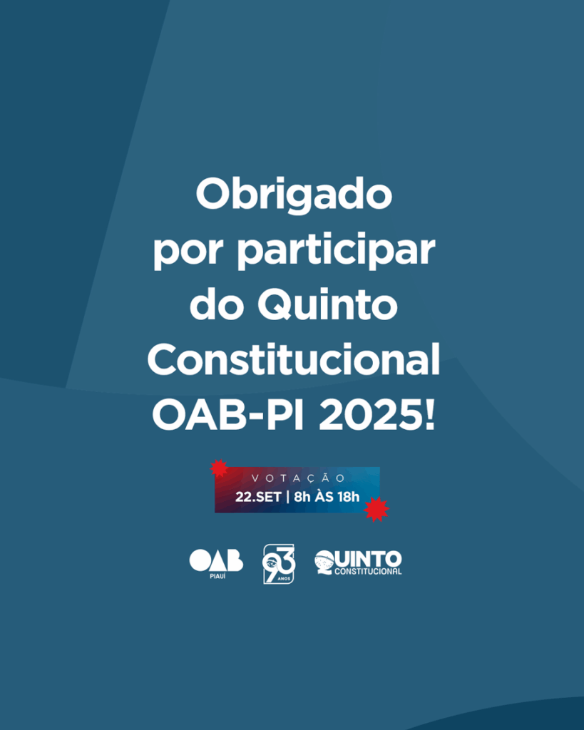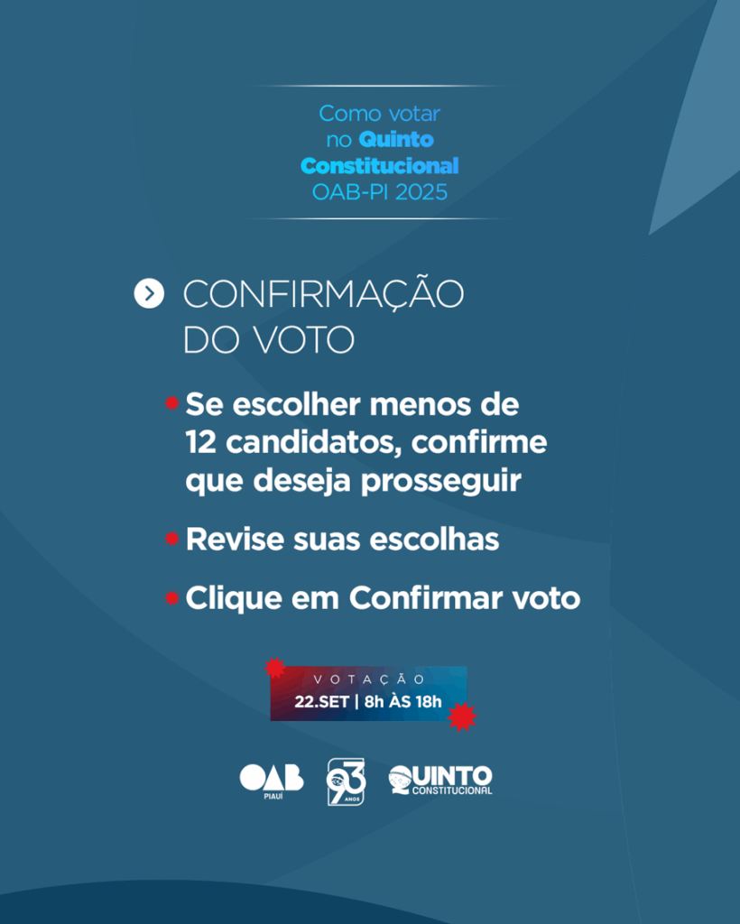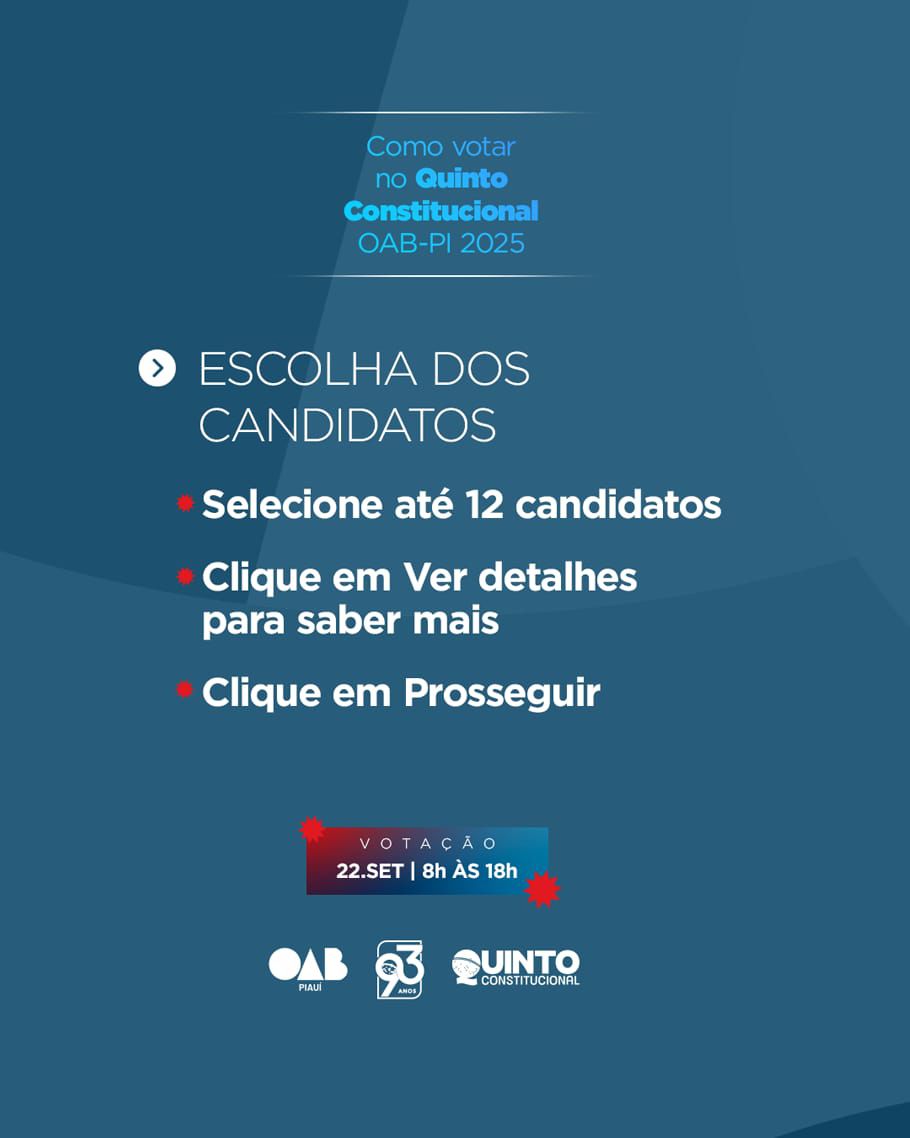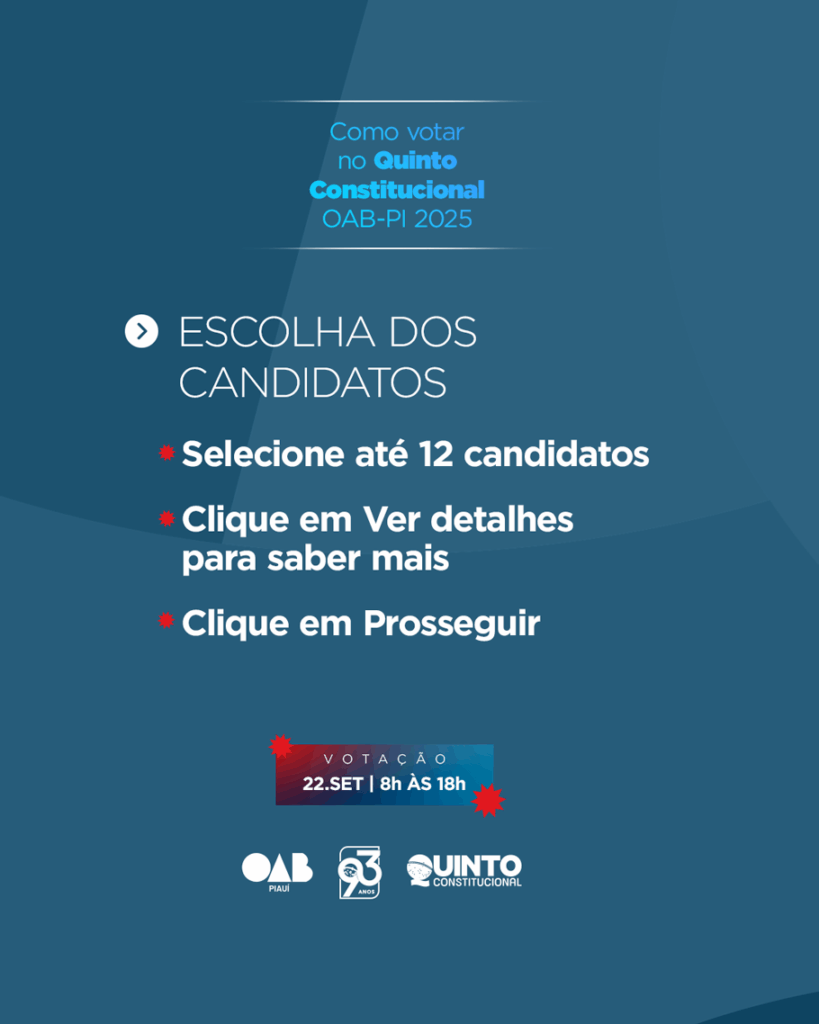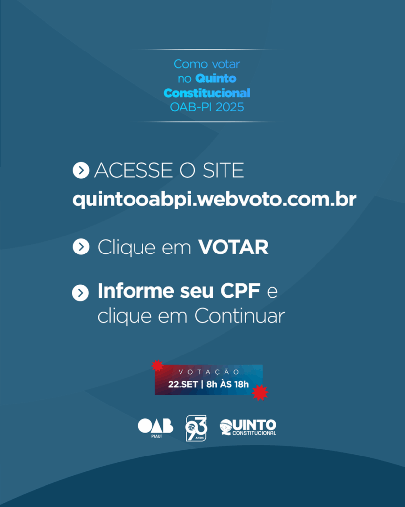 A eleição está marcada para o dia 22 de setembro, quando a advocacia piauiense poderá votar de forma 100% online em até 12 nomes. Os mais votados serão, posteriormente, sabatinados pelo Conselho Pleno da OAB-PI, que formará a lista sêxtupla a ser encaminhada ao Tribunal de Justiça do Estado do Piauí.