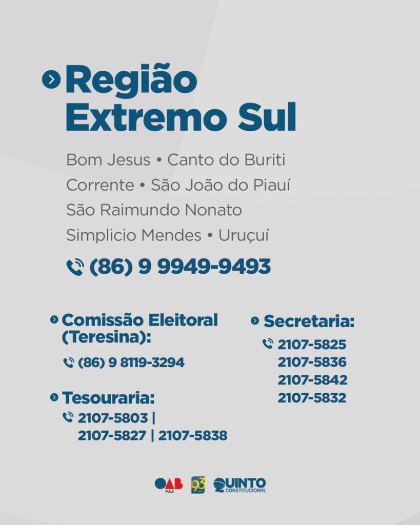Além do suporte digital, a Ordem também disponibilizou contatos regionais para atendimento telefônico. Com esses canais de atendimento, a OAB-PI reforça seu compromisso em garantir uma eleição segura, transparente e acessível para toda a advocacia piauiense.