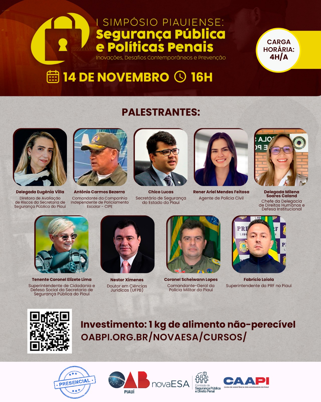 O simpósio contará com a participação de nomes de destaque, como o Secretário de Segurança Pública do Piauí, Chico Lucas, o Comandante-Geral da Polícia Militar do Piauí, Scheiwann Lopes, a delegada Eugênia Villa, e o Superintendente da Polícia Rodoviária Federal no Piauí, Fabrício Loiola, que se juntarão a outros especialistas para uma série de palestras sobre os mais urgentes temas da área. A presença dessas autoridades reforça a importância do evento para a construção de soluções eficazes no enfrentamento da violência e na promoção da segurança no Estado.