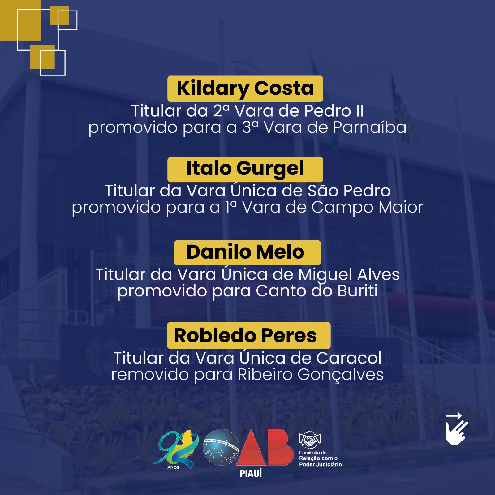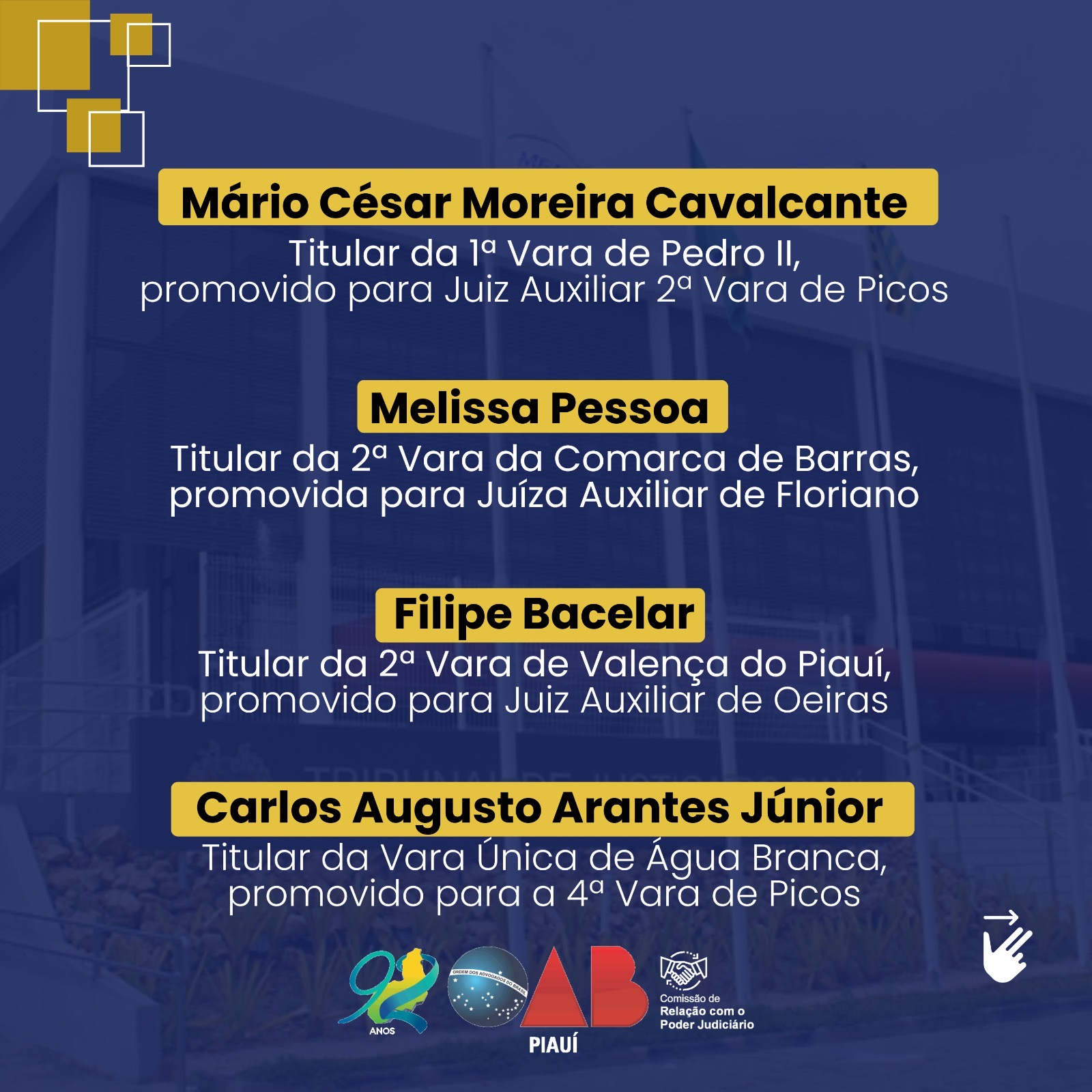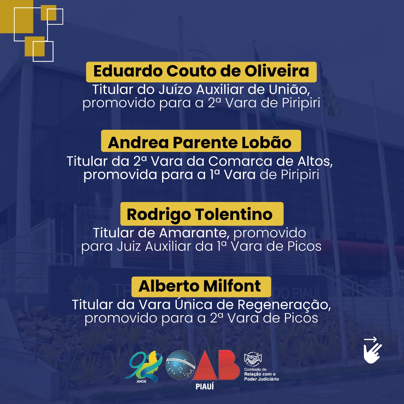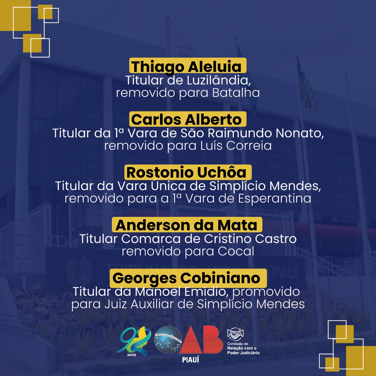 Os juízes promovidos e removidos serão lotados em unidades judiciárias de Teresina, Piripiri, Picos, Floriano, Oeiras, Campo Maior, Canto do Buriti, Parnaíba, Ribeiro Gonçalves, Altos, Batalha, Luís Correia, Esperantina, Cocal e Simplício Mendes.