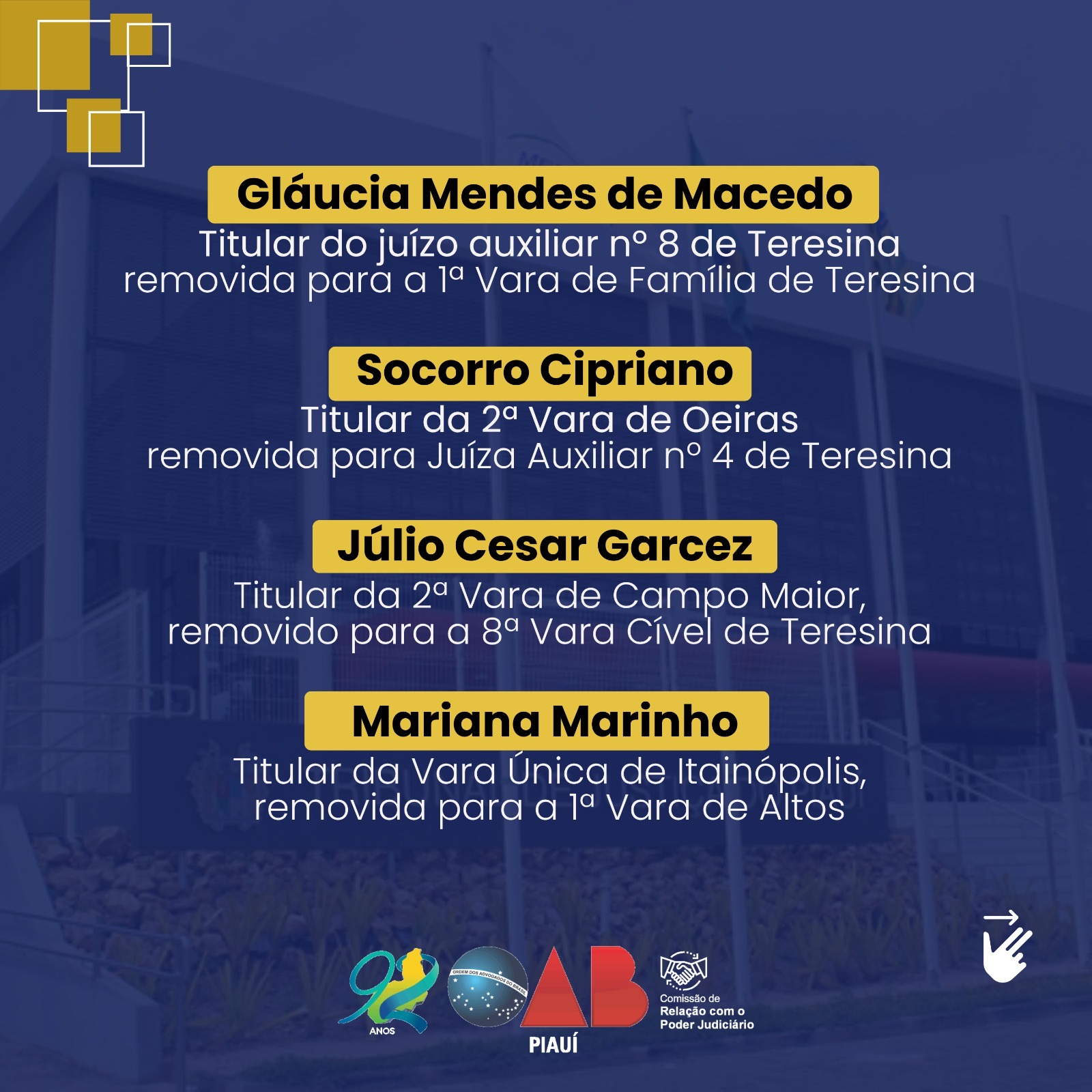 Ao tempo em que foi informado que, todos os juízes promovidos e removidos ficarão respondendo pelas comarcas anteriores até o dia 1/12/2024, com exceção da 2 Vara de Barras e da 2 Vara de Altos, as quais foram designadas as juízas substitutas Luciana Damasceno e Ana Carolina, respectivamente, para responder já a partir desta última terça-feira (22/10).