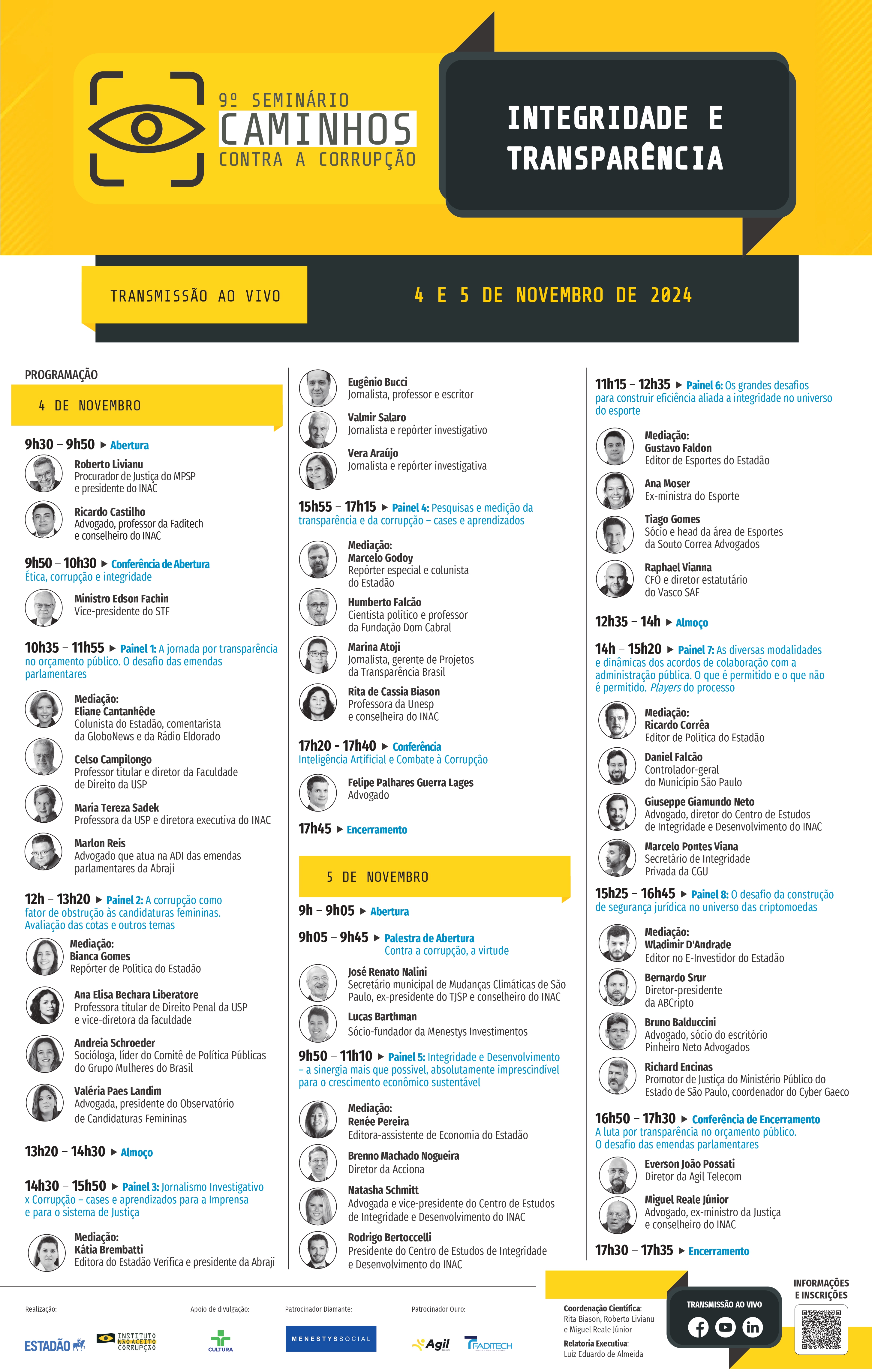 O Seminário Caminhos Contra a Corrupção se tornou como um dos principais espaços de debate nacional sobre transparência, integridade e compliance. Os painéis e conferências deste ano serão transmitidos ao vivo no site do Estadão.