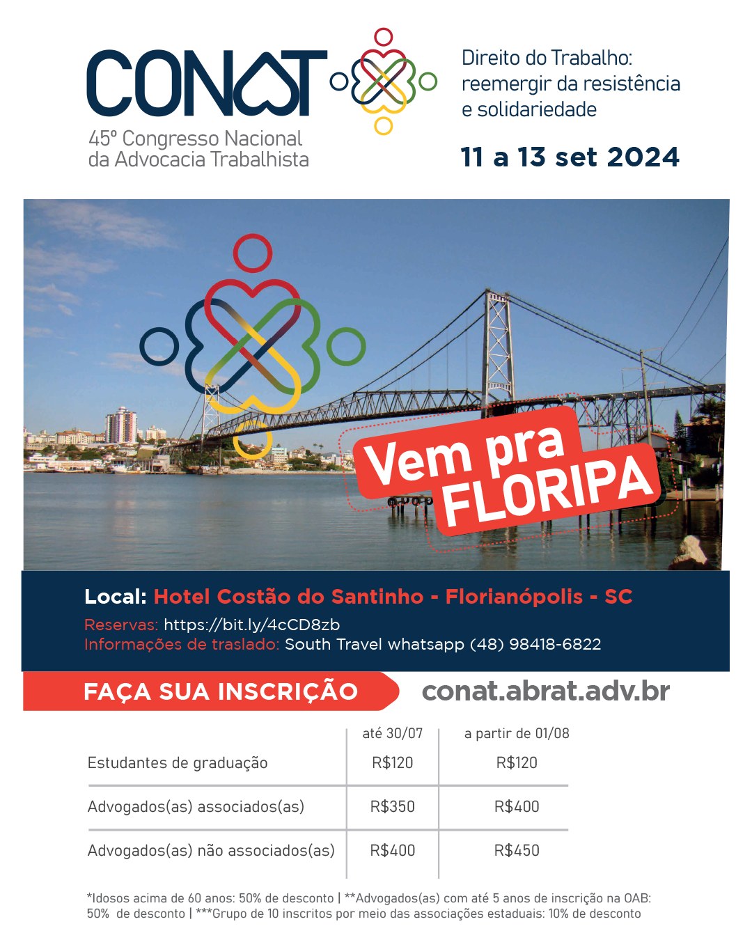 Entre os dias 11 e 13 de setembro, a Associação Brasileira de Advogados Trabalhistas realizará o 45° Congresso Nacional da Advocacia Trabalhista – Direito do Trabalho: Reemergir da resistência e solidariedade, no Costão do Santinho, Florianópolis/SC.