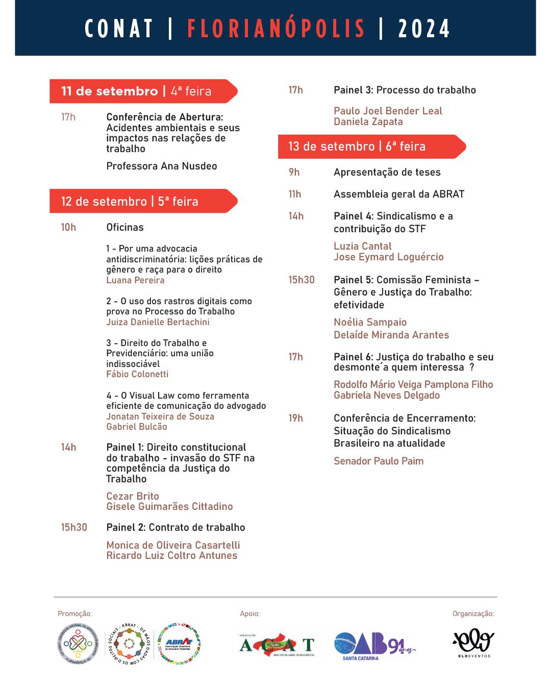 O evento irá debater diversos pontos importantes para a prática da advocacia trabalhista, buscando a atualização e a qualificação dos profissionais. Entre as temáticas estão: Acidentes ambientais e seus impactos nas relações de trabalho, Direito Constitucional do Trabalho e Situação do Sindicalismo Brasileiro na atualidade.