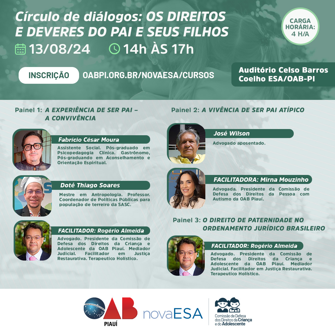 A Comissão de Defesa dos Direitos das Crianças e Adolescentes da Ordem dos Advogados do Brasil, Seccional Piauí, promoverá o evento “Círculo de Diálogos: Os Direitos e Deveres do Pai e Seus Filhos”, na terça-feira (13/08), às 14h.