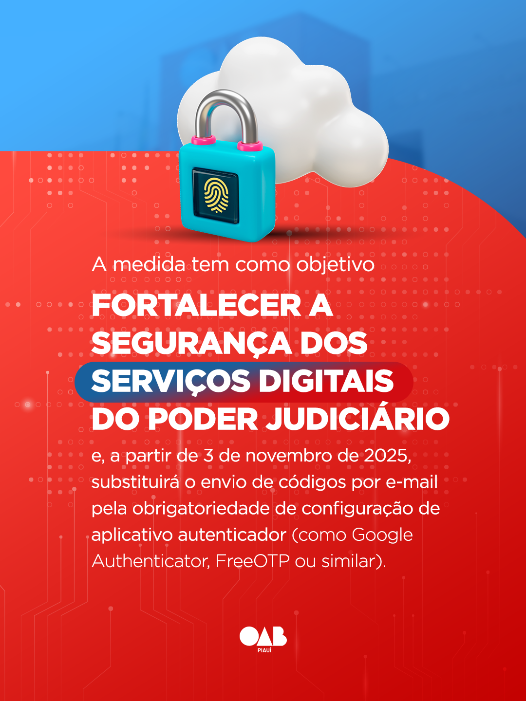 A partir de 3 de novembro de 2025, o acesso ao PJe (Processo Judicial Eletrônico) e a outros serviços digitais integrados ao Portal jus.br passará a exigir duplo fator de autenticação (2FA) por meio de aplicativos autenticadores, como Google Authenticator, FreeOTP ou similares.