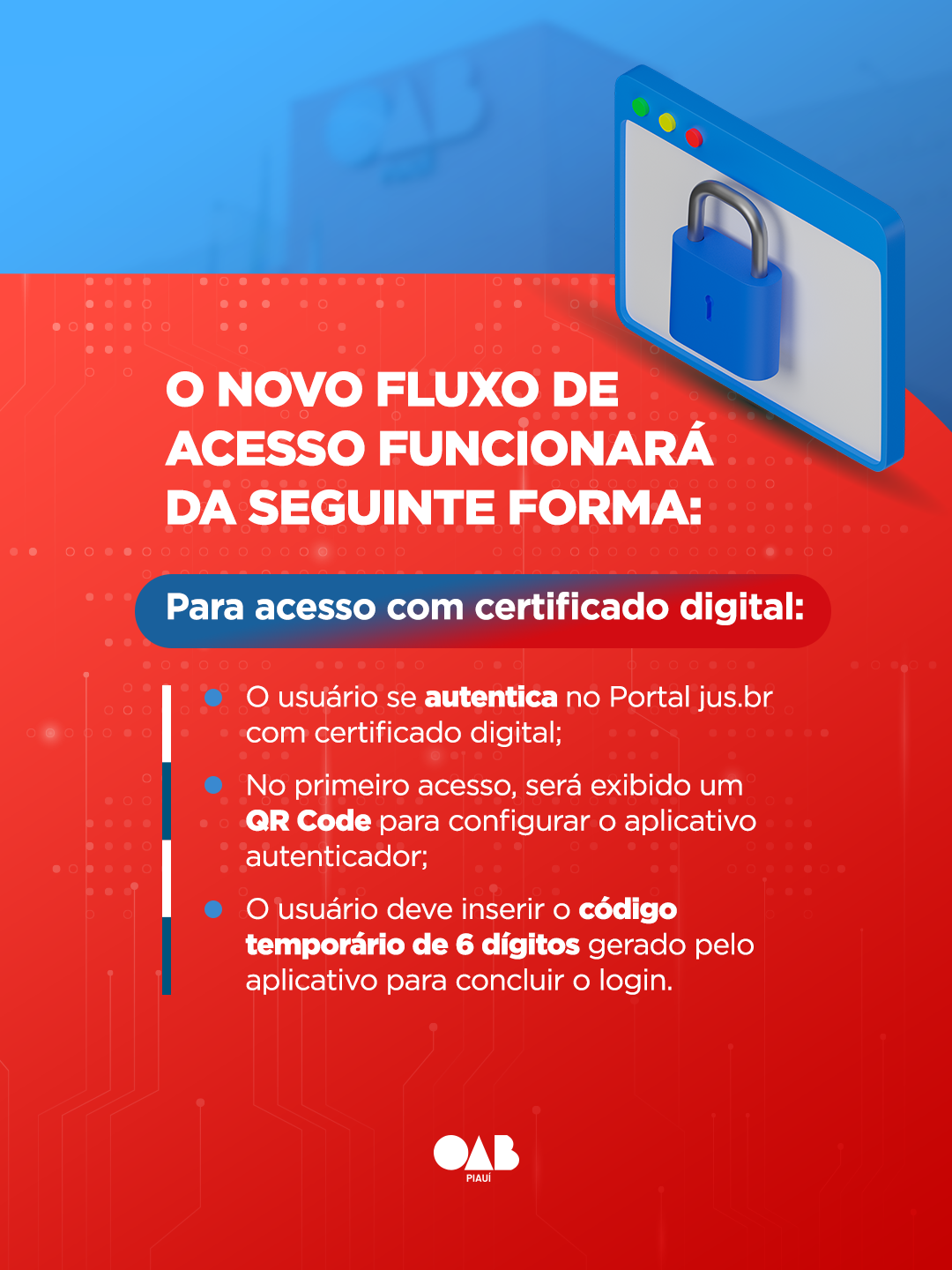Usuários com certificado digital: no primeiro acesso após a mudança, será necessário escanear um QR Code apresentado na tela e inserir o código de seis dígitos gerado pelo aplicativo autenticador.