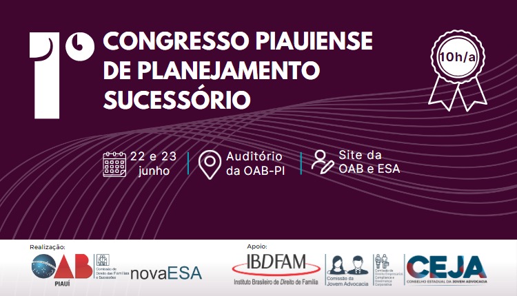 OAB Piauí realizará o 1º Congresso Piauiense de Planejamento Sucessório nos dias 22 e 23 de junho