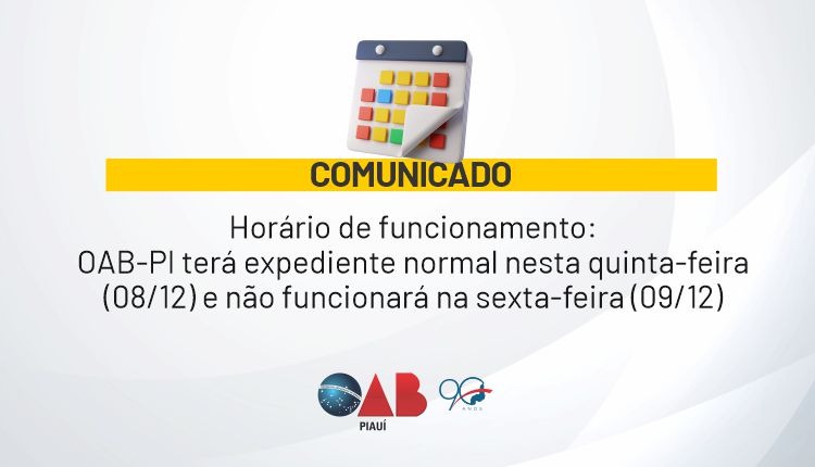 Horário de funcionamento: OAB-PI terá expediente normal nesta quinta-feira (08/12) e não funcionará na sexta-feira (09/12)
