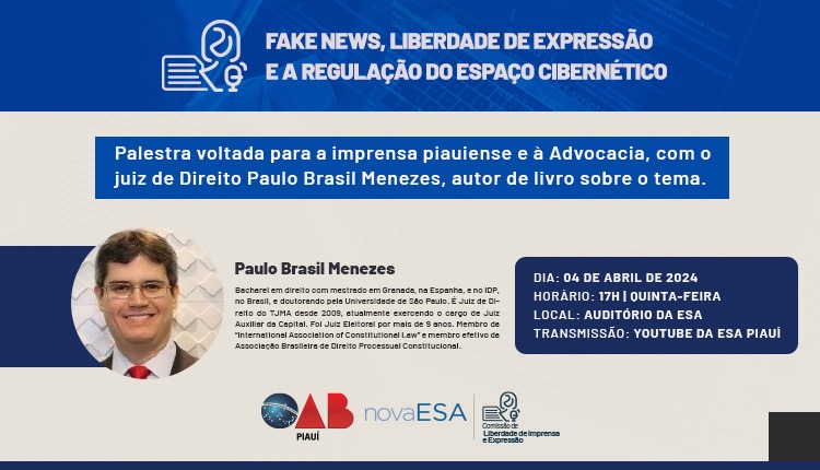 A Comissão de Liberdade de Imprensa e Expressão da OAB-PI promoverá palestra sobre “Fake News, Liberdade de Expressão e Regulação do Espaço Cibernético”