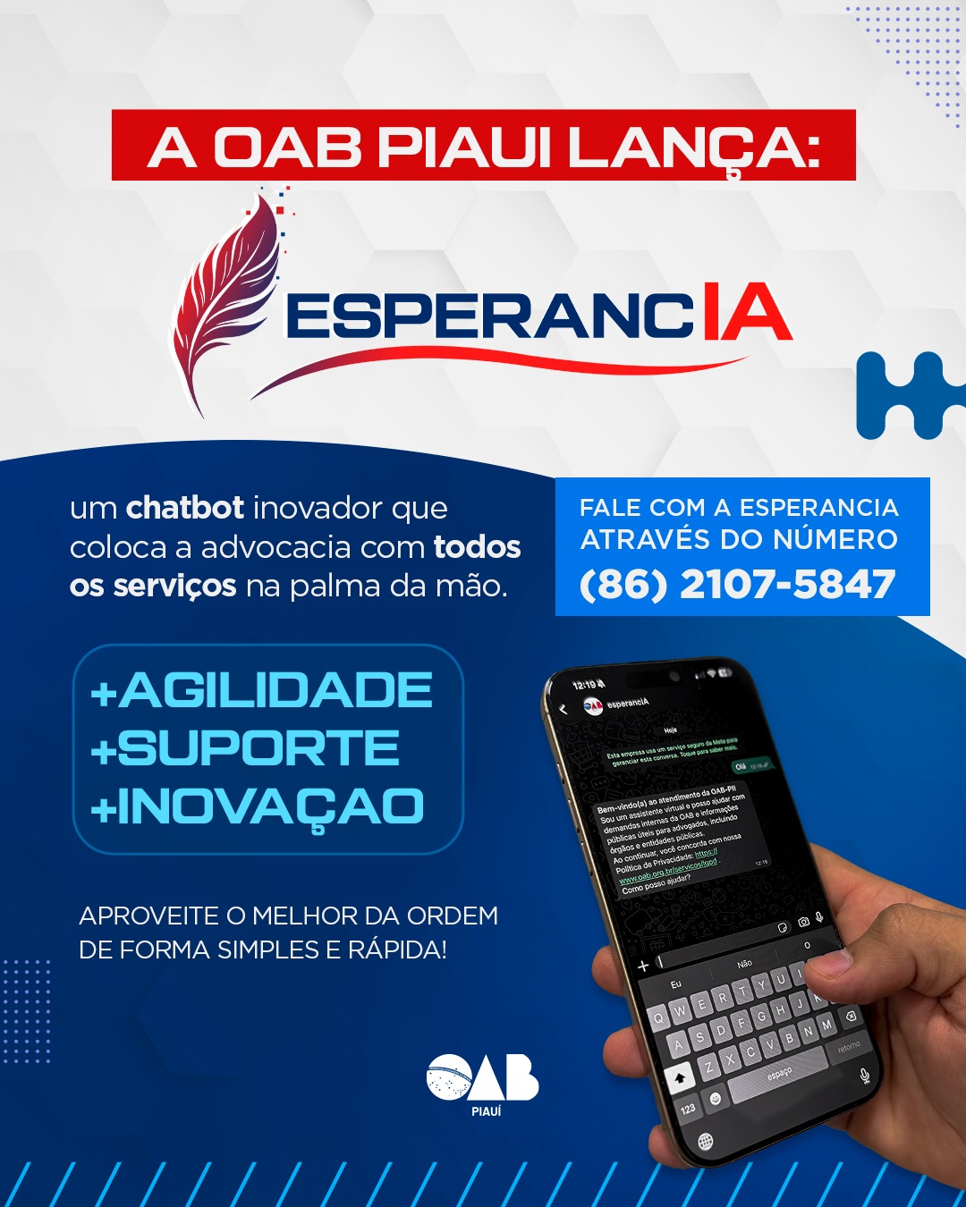 A Ordem dos Advogados do Brasil, Seccional Piauí (OAB-PI), lançou na terça-feira (07/04) o EsperancIA, chatbot institucional desenvolvido para ampliar o acesso da advocacia a serviços essenciais oferecidos pela Seccional. A ferramenta já está disponível por meio do número (86) 2107-5847.