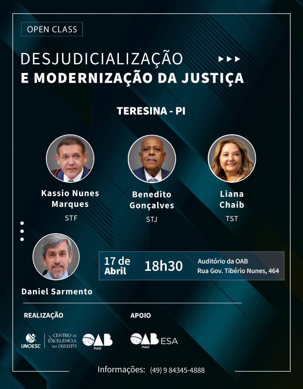 Nesta sexta-feira (17/04), a Ordem dos Advogados do Brasil, Seccional Piauí (OAB-PI), sediará a Open Class “Desjudicialização e Modernização da Justiça”, promovida pelo Centro de Excelência em Direito da UNOESC. O evento acontecerá às 18h30, no Auditório da OAB-PI, em Teresina.