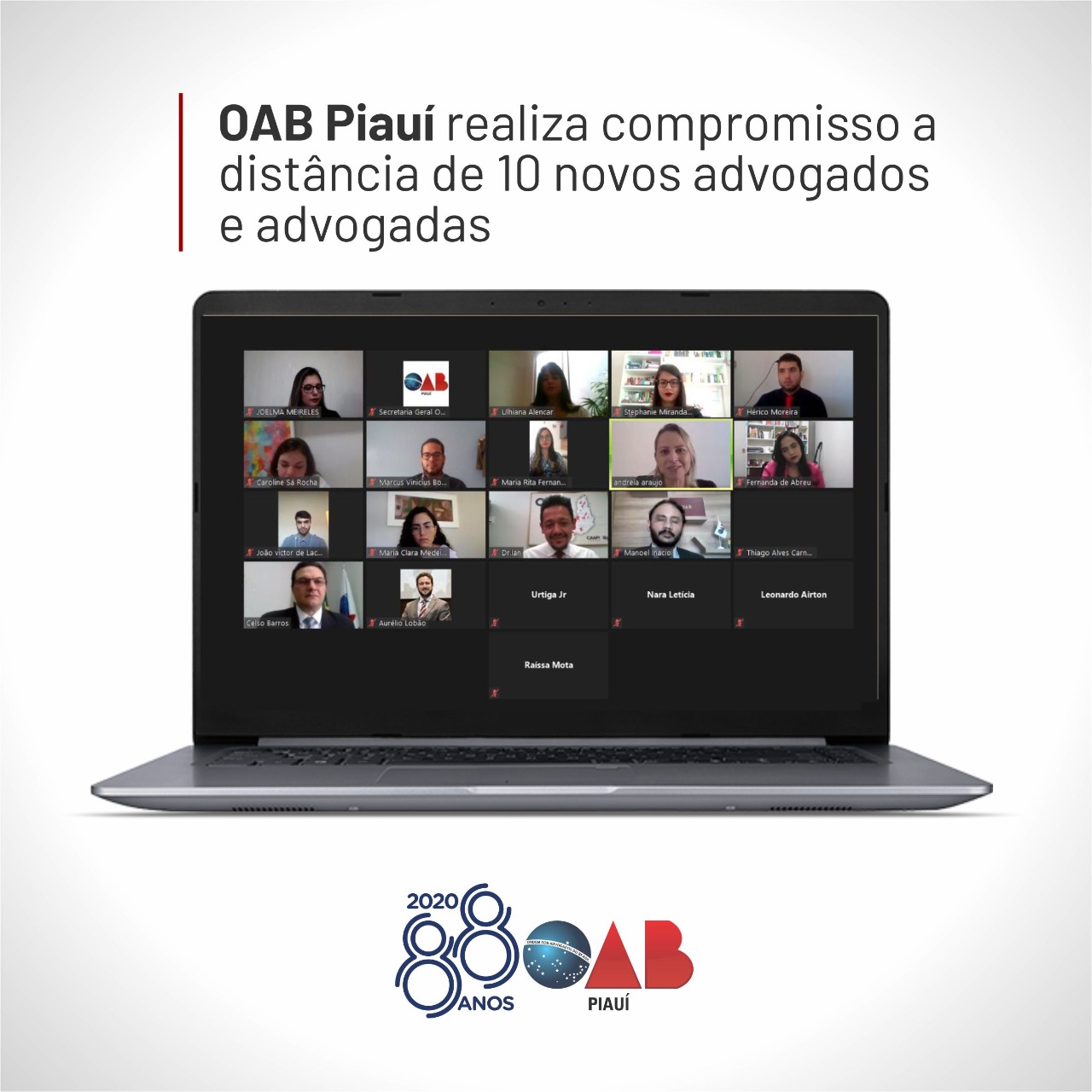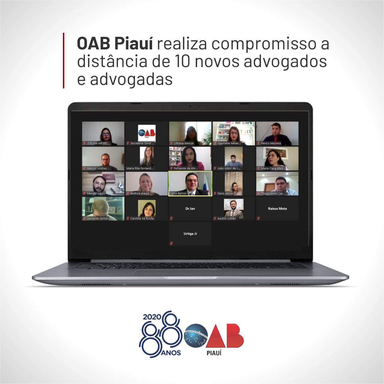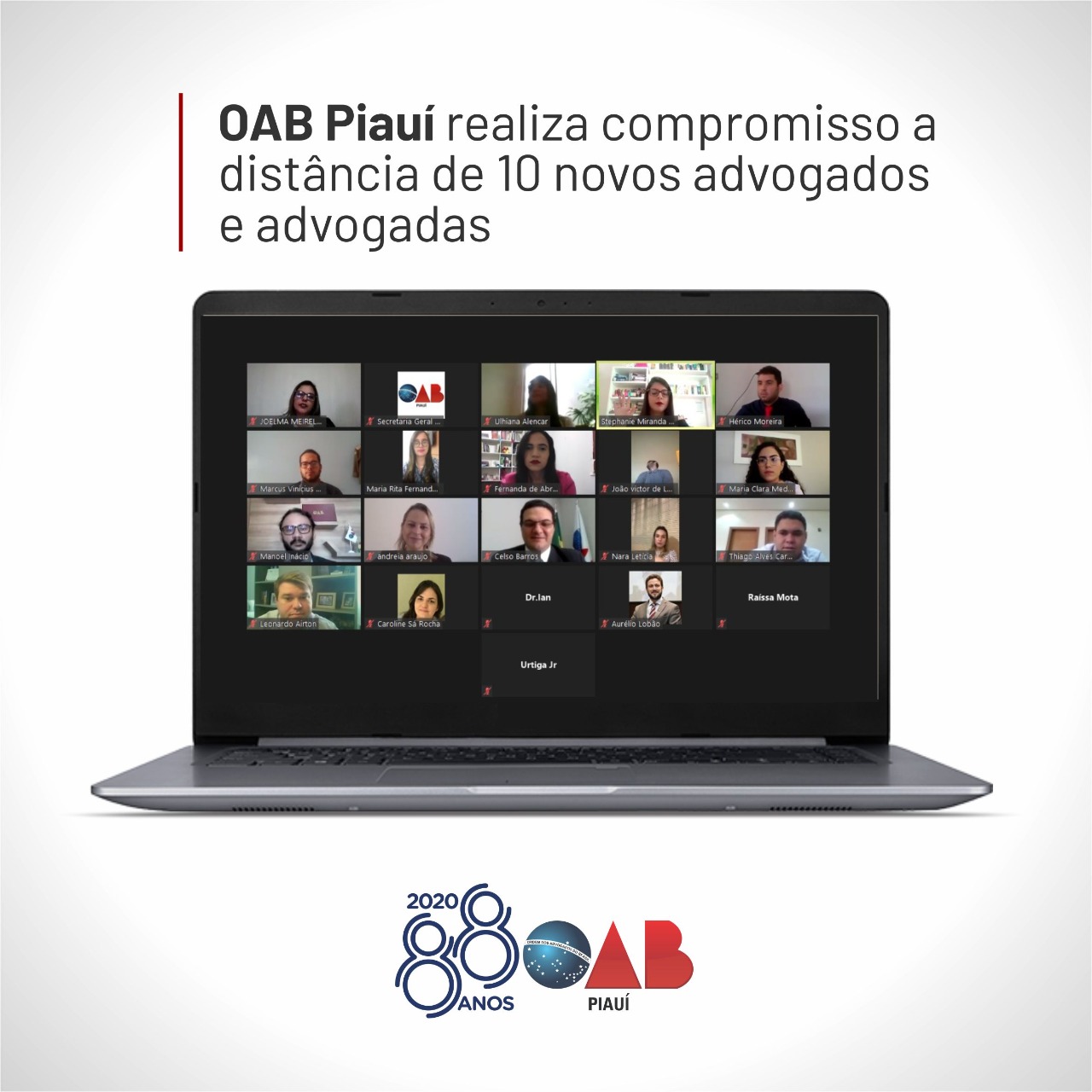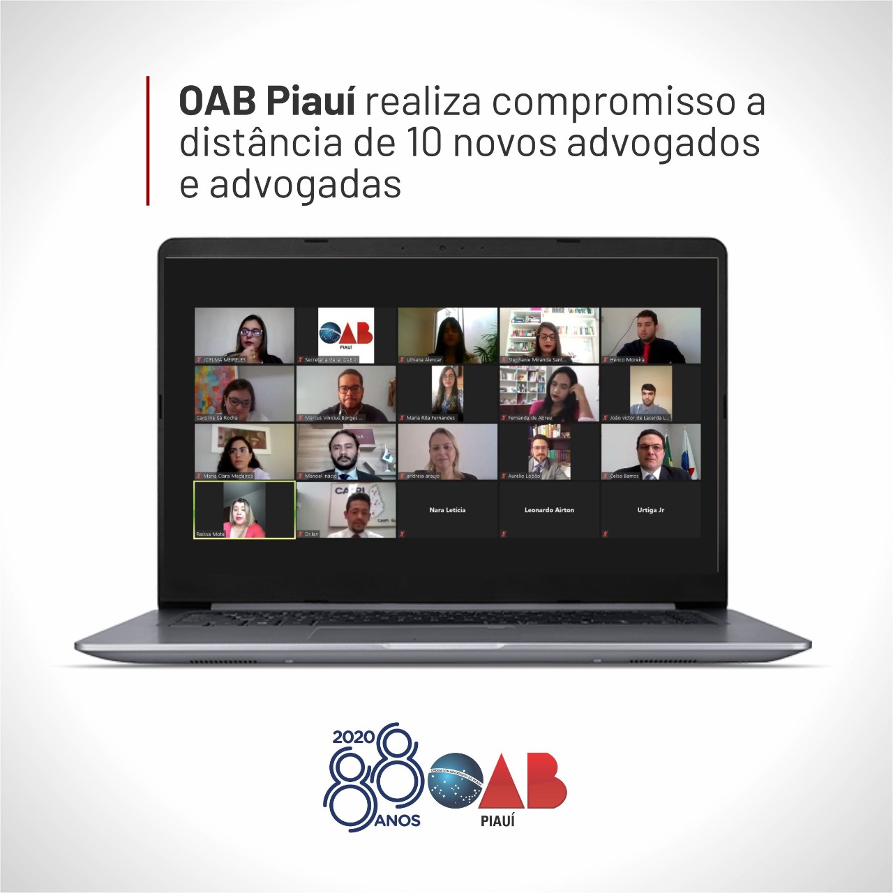 Em mais uma missão institucional, a Ordem dos Advogados do Brasil, Seccional Piauí, realizou um compromisso a distância de 10 novos advogados e advogadas nesta quinta-feira (11). A solenidade foi realizada por meio de videoconferência e foi conduzida pelo Presidente da OAB Piauí, Celso Barros Coelho Neto, que parabenizou os compromissandos.