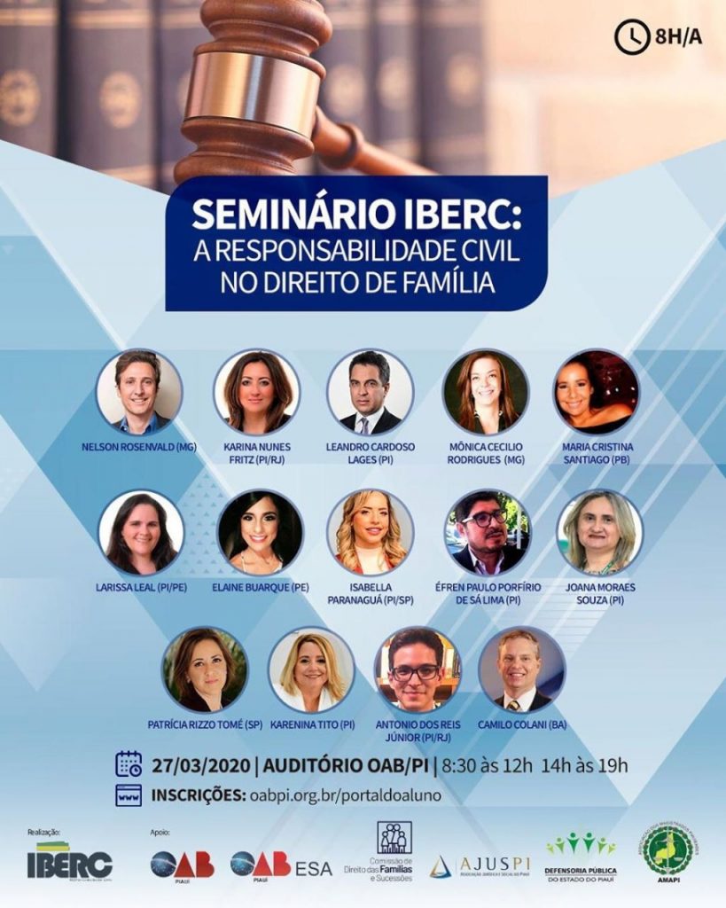 A OAB Piauí sediará o I Seminário sobre Responsabilidade Civil no Direito de Família, promovido pelo Instituto Brasileiro de Estudos de Responsabilidade Civil (IBERC). O evento, pioneiro do Estado, acontecerá no dia 27 de março e contará com uma vasta programação que reúne grandes nomes da área do Direito de Famílias.